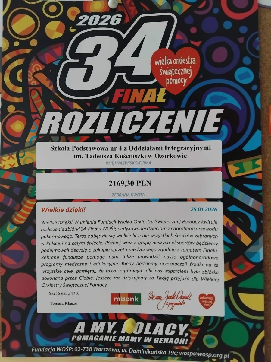 Sztab Wielkiej Orkiestry Świąteczne Pomocy przekazał właśnie rozliczenie naszej szkolnej puszki. Udało nam się zebrać 2169 zł i 30 gr.